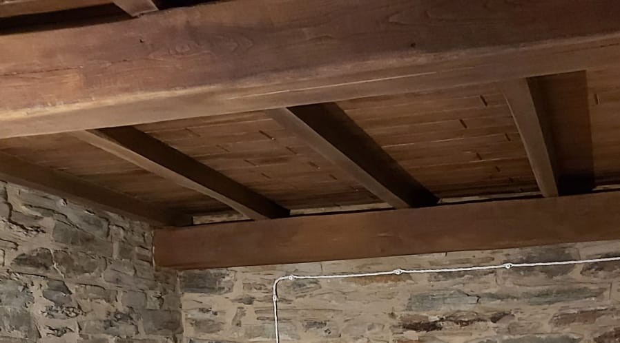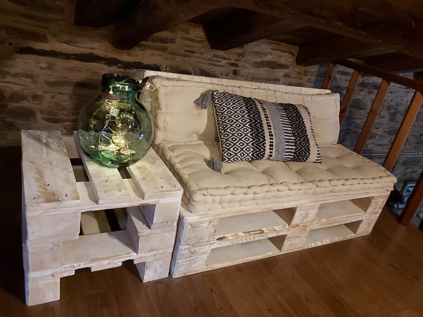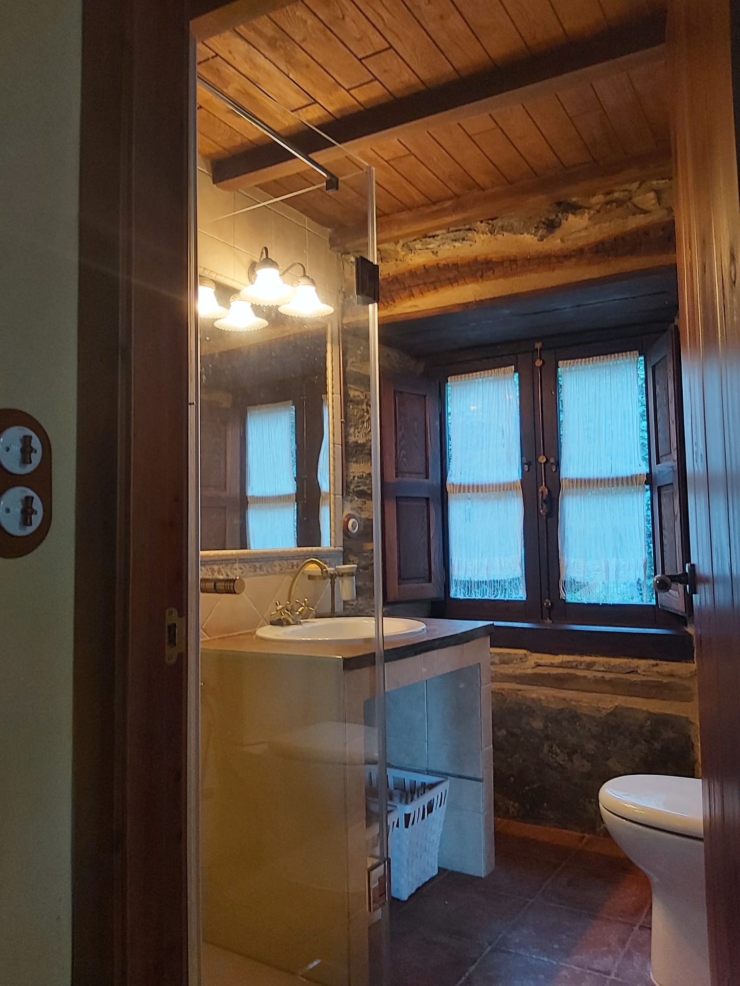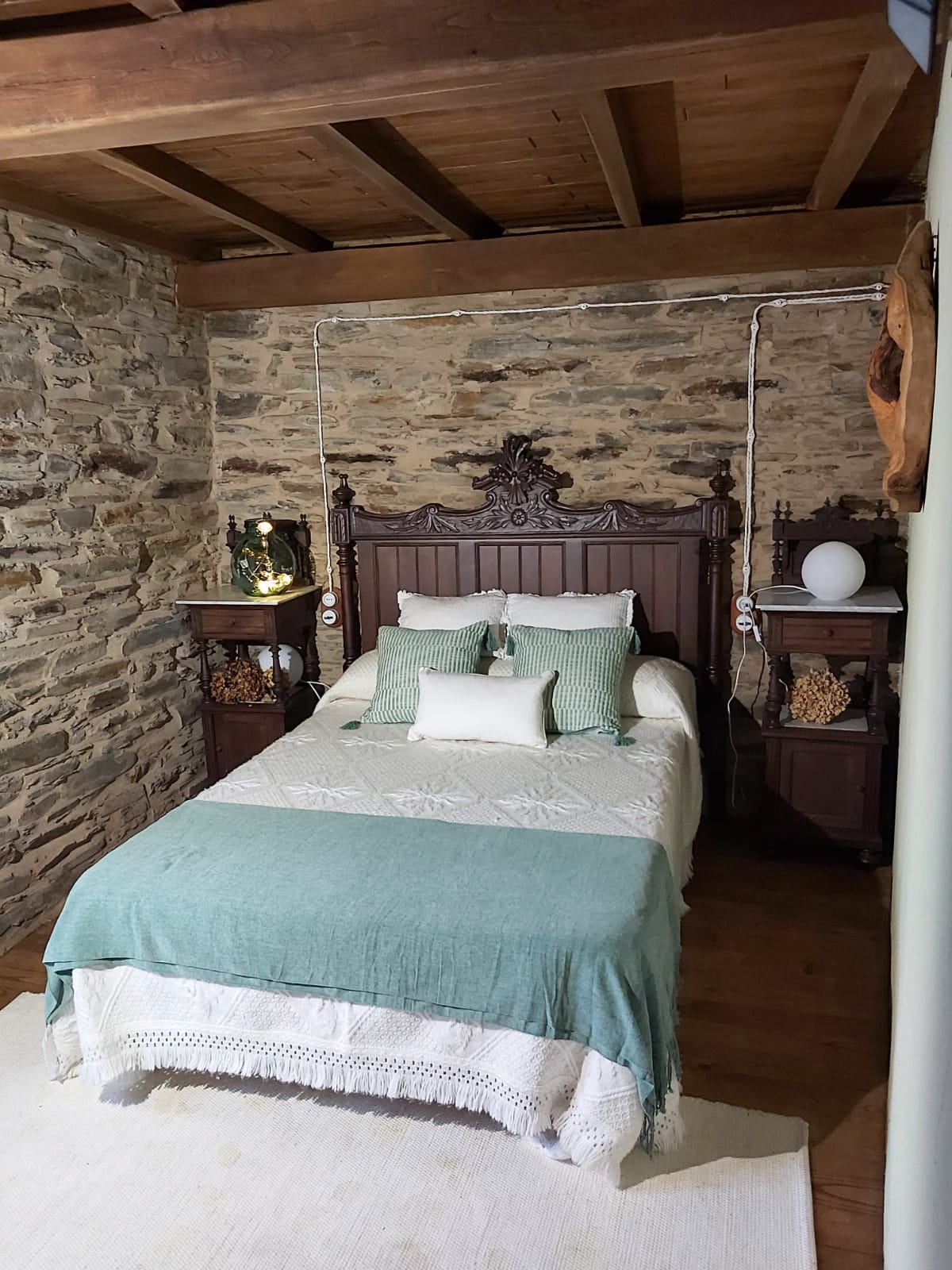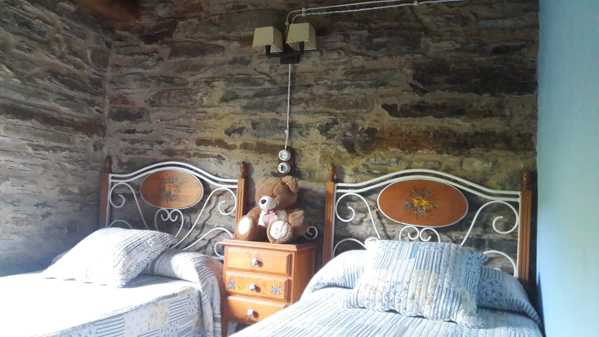 A través de esta zona se accede a dos dormitorios y un baño; un dormitorio consta de una cama de matrimonio, mesillas y armario, herencia de los antepasados y con una solera de más de 100 años. El otro dormitorio dispone de dos camas gemelas y mobiliario pintado a mano. Una escalera de madera, que parte del salón, conduce a una zona abierta abuhardillada desde la cual puedes contemplar las estrellas desde una cama de 1.80 de estilo japonés. Esta acogedora estancia, coronada por vigas de madera, incluye una pequeña y pintoresca zona de estar.
