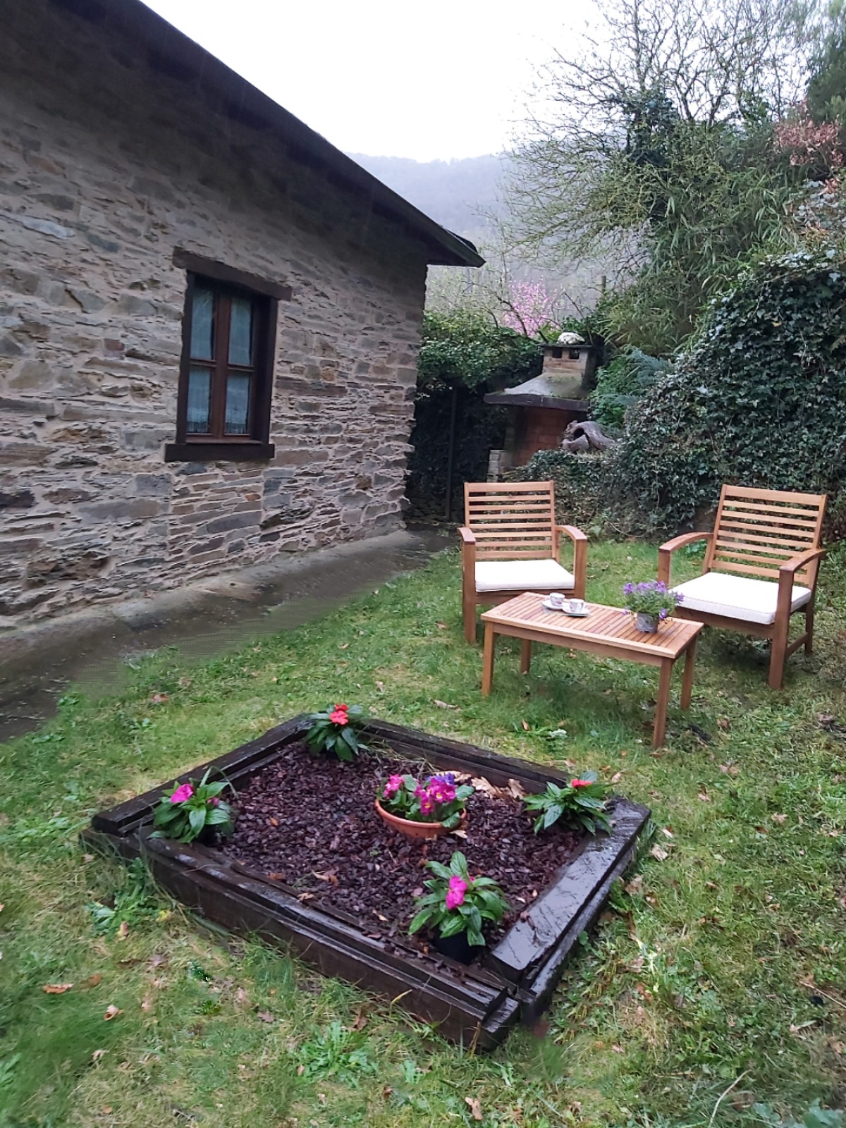 En cuanto a la parte exterior, la casa dispone de dos zonas perfectamente diferenciadas: una pequeña área ajardinada con una zona para el disfrute y el relax y otra destinada a barbacoa y comedor al aire libre desde donde se puede contemplar un frondoso bosque gallego y un río de montaña.
